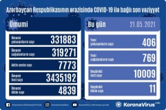 Azərbaycanda son sutkada 769 nəfər COVID-19-dan sağalıb, 406 nəfər yoluxub