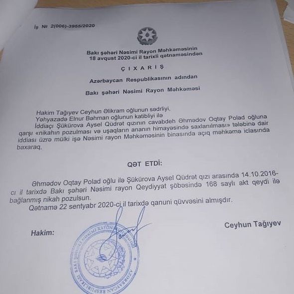Axşam.az-ın xəbərinə görə, bu haqda Oqtay məlumat verib. O, boşanma sənədini yayımlayaraq prosesin sentyabrın 22-də yekunlaşdığını deyib: