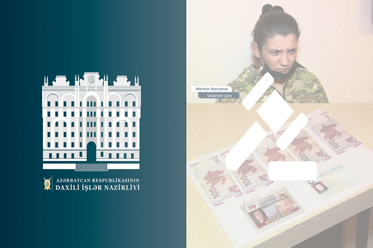 Daxili İşlər Nazirliyinin mətbuat xidmətindən verilən məlumata görə, Abşeron rayonunda yerləşən ictimai iaşə obyektlərindən birinin sahibi Rayon Polis İdarəsinin Mehdiabad Polis Bölməsinə şikayət edərək tanımadığı bir nəfərin özünü jurnalist kimi təqdim edərək guya obyektdə karantin qaydalarının pozulduğunu və bu barədə reportaj hazırlamamaq üçün ondan hədə-qorxu yolu ilə pul tələb etdiyini bildirib. Bölmə əməkdaşlarının həyata keçirdikləri əməliyyat-axtarış tədbirləri nəticəsində qeyd edilən qanun pozuntusunu törətməkdə şübhəli bilinən Nərmin Hacıyeva obyektin sahibindən 500 manat alan zaman saxlanılaraq Mehdiabad Polis Bölməsinə gətirilib. Onun üzərində şəxsi axtarış aparılan zaman hədə-qorxu yolu ilə əldə etdiyi pul vəsaiti, saxta jurnalist vəsiqəsi və digər maddi sübutlar aşkar olunaraq götürülüb. O, ifadəsində özünü jurnalist kimi təqdim edərək qeyd edilən hadisəni törətdiyini etiraf edib.