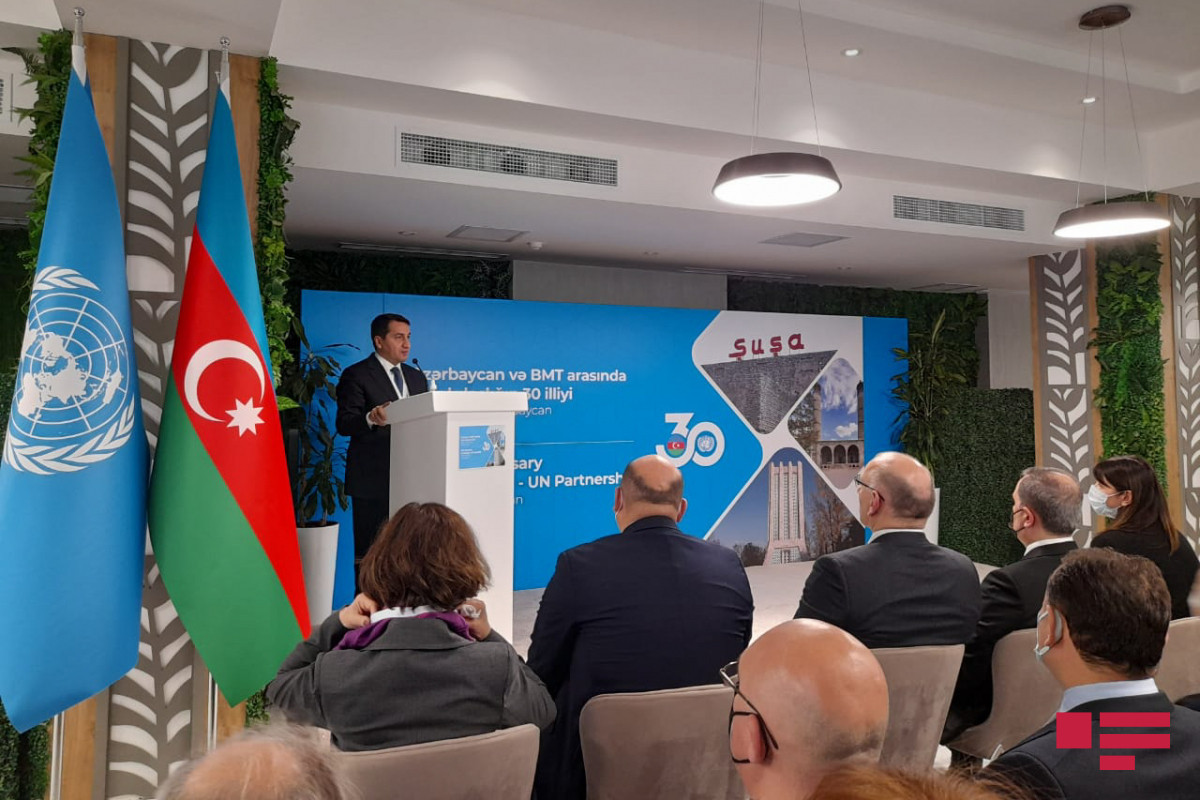 Hikmət Hacıyev qeyd edib ki, BMT-Azərbaycan əməkdaşlığında xüsusən 2012-2013-cü illərdə Azərbaycanın BMT Təhlükəsizlik Şurasının qeyri-daimi üzvlüyünə seçilməsi qeyd olunmalıdır: “Həmin dövrdə Prezident İlham Əliyev tərəfindən Azərbaycanın prioritetləri qeyd olunmuşdu. Bildirilmişdi ki, biz beynəlxalq hüququn norma və prinsiplərini qoruyacağıq. BMT-Azərbaycan münasibətlərində sülh və təhlükəsizlik gündəliyi ilə bərabər Azərbaycan davamlı inkişaf gündəliyində də yaxından iştirak edir. Azərbaycanın bu gün milli prioritetləri müəyyən olunub. Bunlar qarşıdan gələn 2030-cu ilə qədər Azərbaycanın inkişafını nəzərdə tutan prioritetlərdir. Milli prioritetlərimizlə BMT-nin Davamlı İnkişaf Məqsədləri arasında çox ahəngdar bir uyğunluq var. Buna uyğun olaraq da ölkəmizin inkişafı həyata keçirilir. Həmçinin postmünaqişə dövrü ilə əlaqədar BMT-nin aidiyyəti institutları ilə yaxından əməkdaşlıq edilir. Postmünaqişə yenidənqurma və quruculuq işlərində BMT institutları tərəfindən də ölkəmizə müxtəlif ekspert xarakteri daşıyan yardımların və bilgilərin verilməsi çox vacibdir. Ona görə Şuşada keçiriləcək bugünkü konfransımızda 30 illik əməkdaşlığımızı nəzərdən keçirəcəyik ki, nələrə nail olmuşuq, hansı istiqamətlərdə hansı çətinliklərimiz olub. Eyni zamanda, müzakirə aparacağıq ki, Davamlı İnkişaf Məqsədləri hansı formada həyata keçiriləcək. BMT institutları da Azərbaycanda həyata keçirdikləri layihələrdə öz prioritetlərini Azərbaycan Respublikasının müəyyən etdiyi inkişaf prioritetlərinə uyğunlaşdırmalıdırlar”.
