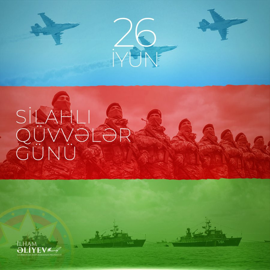 Azərbaycan Respublikasının Prezidenti İlham Əliyev Silahlı Qüvvələr Günü münasibəti ilə Tvitterdə paylaşım edib.