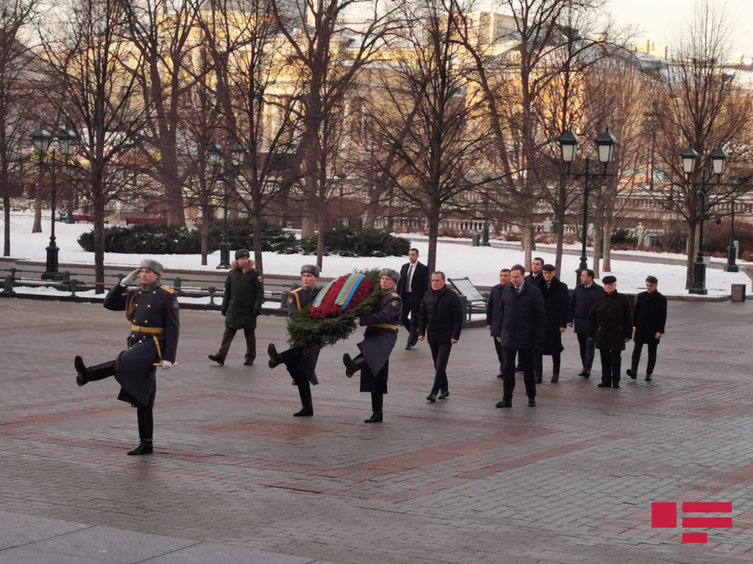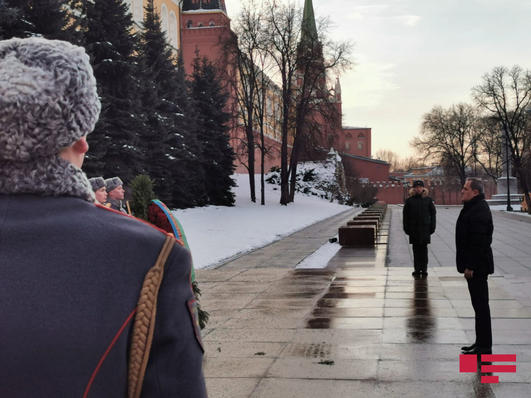 C.Bayramov ilk öncə Aleksandr Bağında "Naməlum əsgər"in məzarı önünə əklil qoyub.