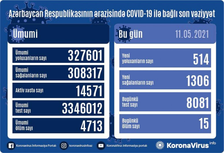 Son sutka ərzində yeni yoluxma hallarının müəyyənləşdirilməsi ilə əlaqədar 8 081, bu günə qədər isə ümumilikdə 3 346 012 test icra olunub.