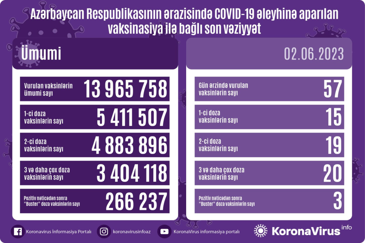 Vurulan vaksinlərin ümumi sayı 13 965 758, birinci mərhələ üzrə vaksinasiya olunanların ümumi sayı 5 411 507, ikinci mərhələ üzrə vaksinasiya olunanların sayı 4 883 896, üç və daha çox doza üzrə vaksinasiya olunanların sayı 3 404 118, pozitiv nəticədən sonra buster doza üzrə vaksinasiya olunanların sayı isə 266 237 nəfər təşkil edir.