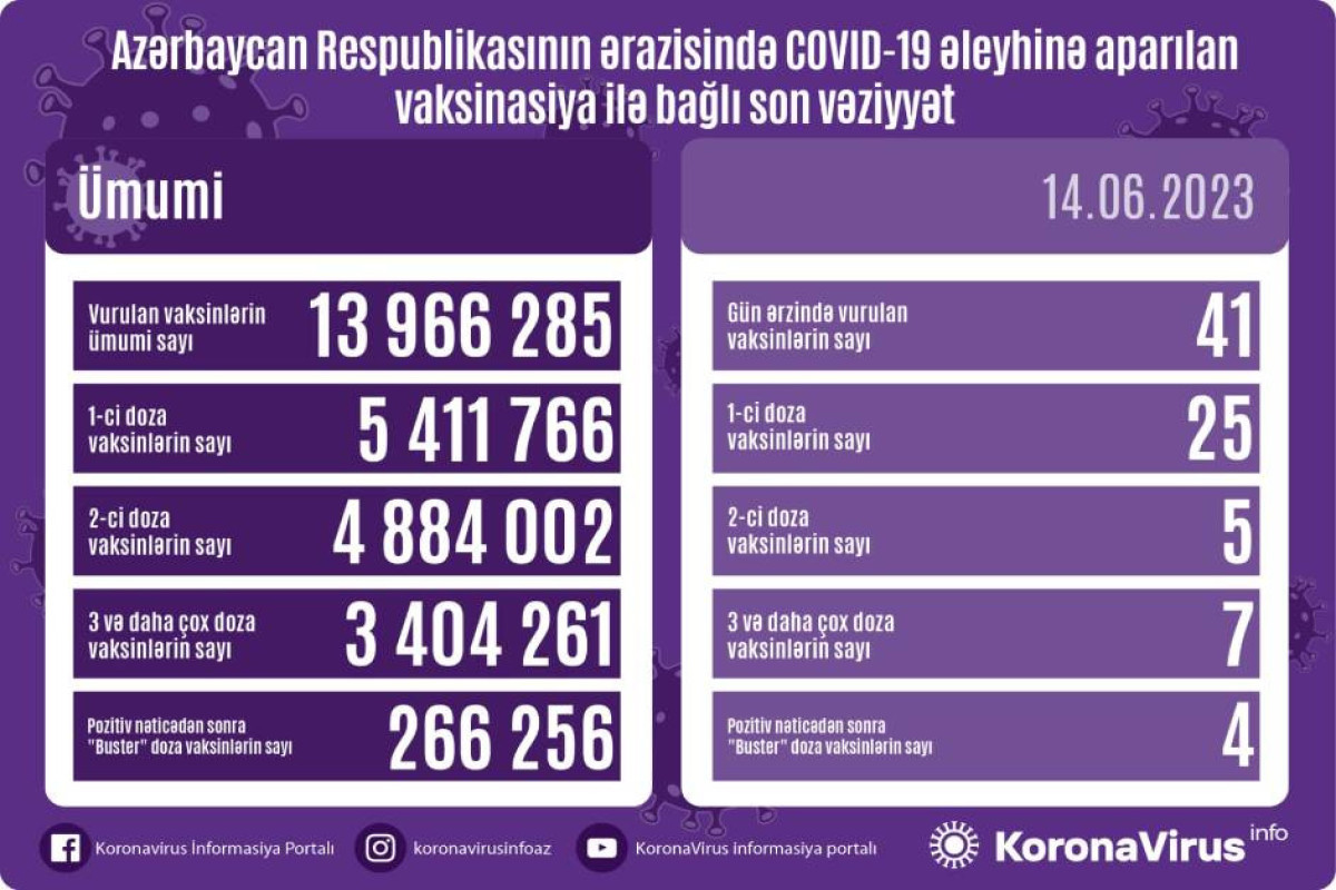 Ölkədə vurulan vaksinlərin ümumi sayı 13 966 285, birinci mərhələ üzrə vaksinasiya olunanların ümumi sayı 5 411 766, ikinci mərhələ üzrə vaksinasiya olunanların sayı 4 884 002, üç və daha çox doza vaksin vurduranların sayı 3 404 261, pozitiv nəticədən sonra buster doza üzrə vaksinasiya olunanların sayı isə 266 256 təşkil edir.