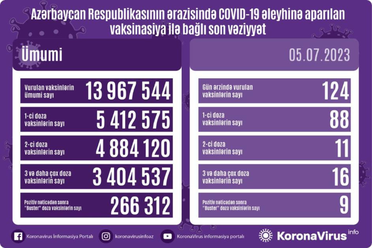 Ölkədə vurulan vaksinlərin ümumi sayı 13 967 544, birinci mərhələ üzrə vaksinasiya olunanların ümumi sayı 5 412 575, ikinci mərhələ üzrə vaksinasiya olunanların sayı 4 884 120, üç və daha çox doza vaksin vurduranların sayı 3 404 537, pozitiv nəticədən sonra buster doza üzrə vaksinasiya olunanların sayı isə 266 312 təşkil edir.