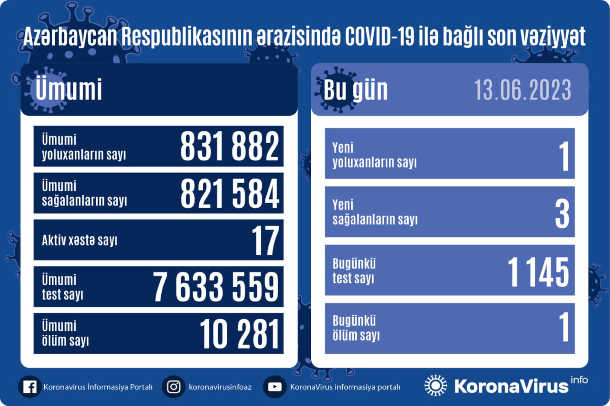 Azərbaycanda indiyədək ümumilikdə 831 882 nəfərin koronavirus infeksiyasına yoluxması faktı müəyyən edilib. Onlardan 821 584 nəfər müalicə olunaraq sağalıb, 10 281 nəfər vəfat edib, aktiv xəstə sayı 17 nəfərdir.