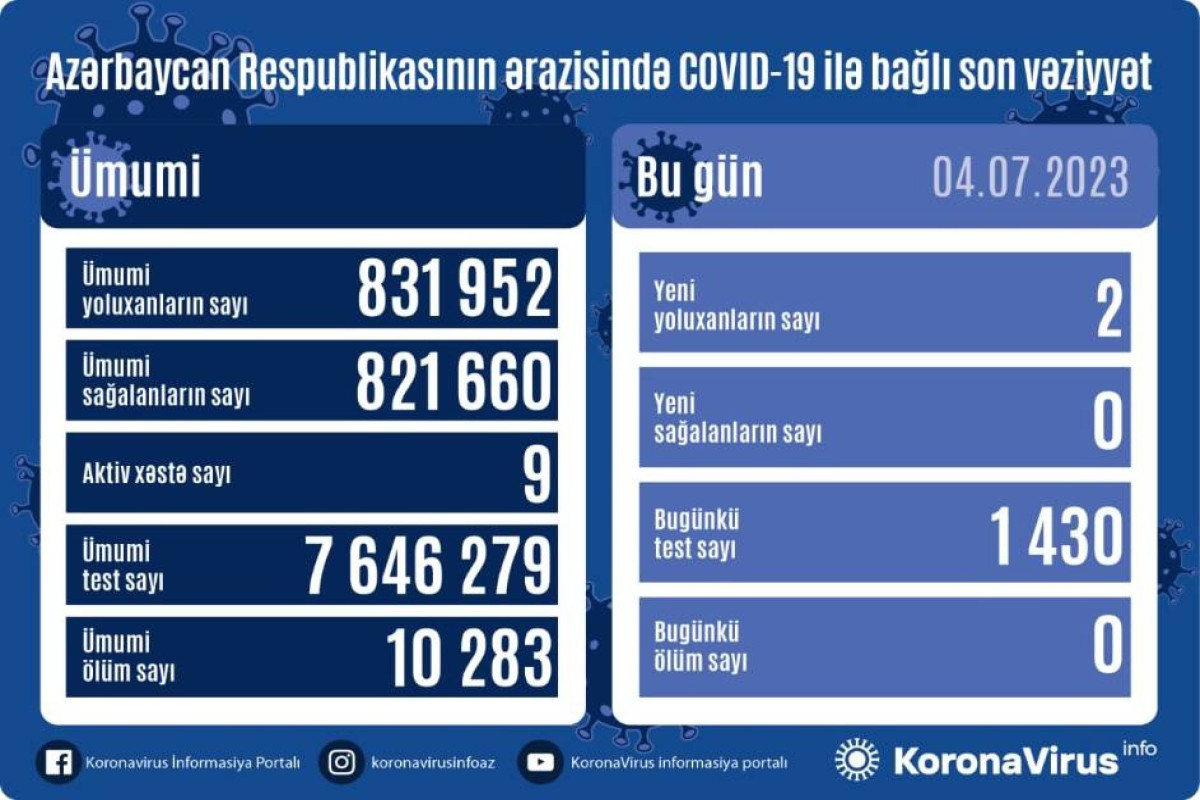 Azərbaycanda indiyədək ümumilikdə 831 952 nəfər koronavirus infeksiyasına yoluxub. Onlardan 821 660 nəfər müalicə olunaraq sağalıb, 10 283 nəfər vəfat edib, aktiv xəstə sayı 9 nəfərdir.