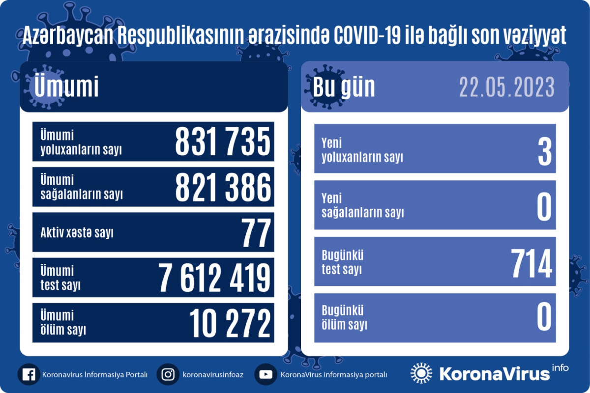 Azərbaycanda indiyədək ümumilikdə 831 735 nəfərin koronavirus infeksiyasına yoluxması faktı müəyyən edilib. Onlardan 821 386 nəfər müalicə olunaraq sağalıb, 10 272 nəfər vəfat edib, aktiv xəstə sayı 77 nəfərdir.