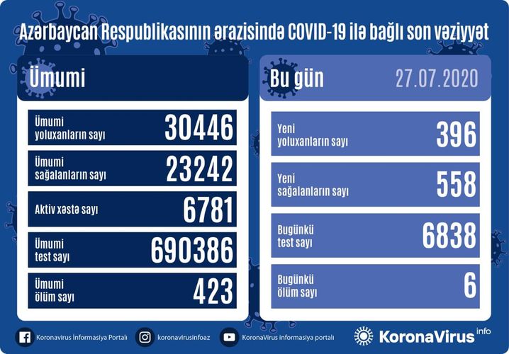 Azərbaycan Respublikasında koronavirus (COVID-19) infeksiyasına 396 yeni yoluxma faktı qeydə alınıb, 558 nəfər müalicə olunaraq sağalıb və evə buraxılıb.