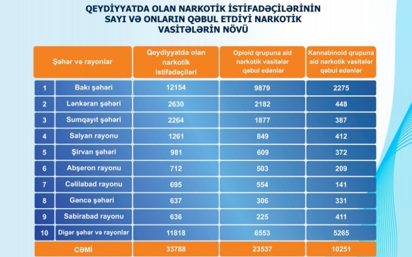 Azərbaycanda qeydiyyatda olan narkotik istifadəçilərinin şəhər və rayonlar üzrə bölgüsü açıqlanıb.