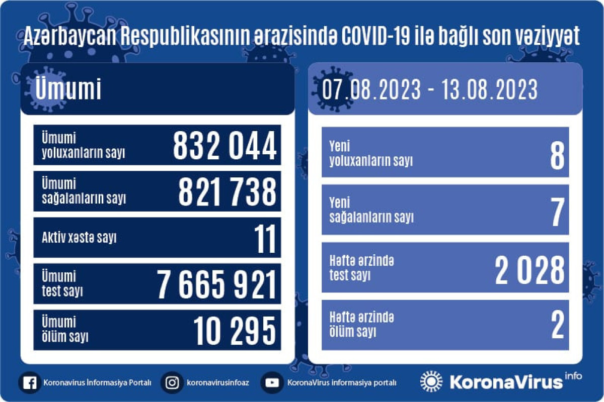 Azərbaycanda koronavirus (COVID-19) infeksiyasına son 1 həftədə (07.08.2023-13.08.2023) 8 yeni yoluxma faktı qeydə alınıb, 7 nəfər müalicə olunaraq sağalıb.