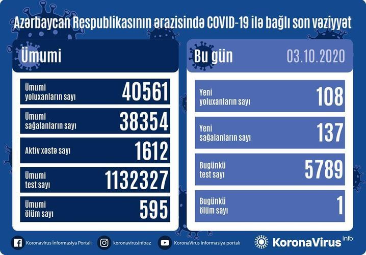 Azərbaycan Respublikasında koronavirus (COVID-19) infeksiyasına 108 yeni yoluxma faktı qeydə alınıb, 137 nəfər müalicə olunaraq sağalıb və evə buraxılıb.