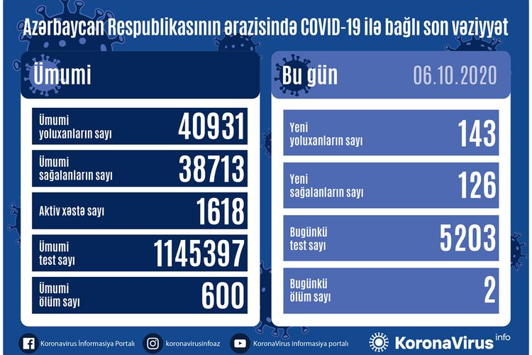 Azərbaycan Respublikasında koronavirus (COVID-19) infeksiyasına 143 yeni yoluxma faktı qeydə alınıb, 126 nəfər müalicə olunaraq sağalıb və evə buraxılıb.