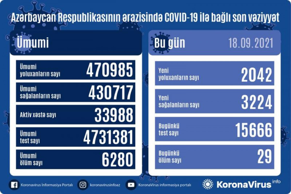 Azərbaycan Respublikasında koronavirus (COVID-19) infeksiyasına 2042 yeni yoluxma faktı qeydə alınıb, 3224 nəfər müalicə olunaraq sağalıb.