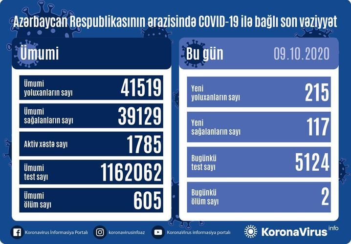 Azərbaycan Respublikasında koronavirus (COVID-19) infeksiyasına 215 yeni yoluxma faktı qeydə alınıb, 117 nəfər müalicə olunaraq sağalıb və evə buraxılıb.
