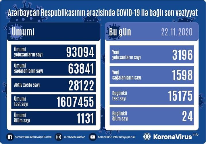 Azərbaycan Respublikasında koronavirus (COVID-19) infeksiyasına 3196 yeni yoluxma faktı qeydə alınıb, 1598 nəfər müalicə olunaraq sağalıb və evə buraxılıb.