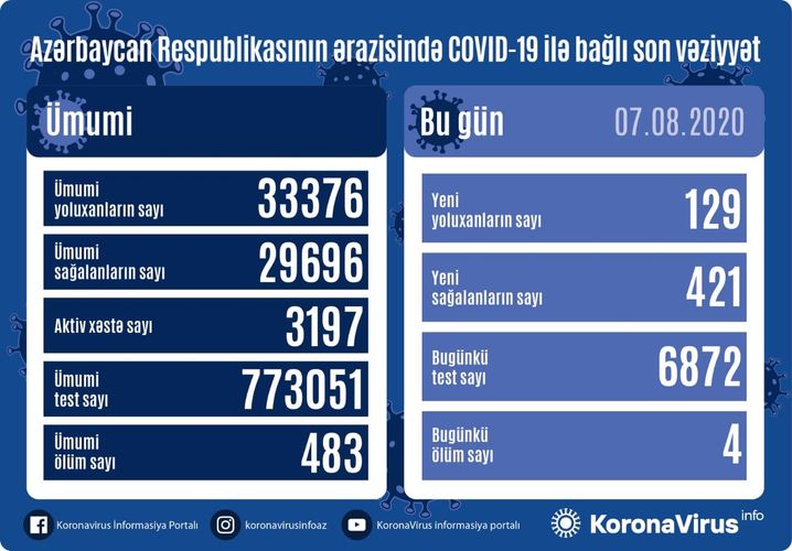 Azərbaycan Respublikasında koronavirus (COVID-19) infeksiyasına 129 yeni yoluxma faktı qeydə alınıb, 421 nəfər müalicə olunaraq sağalıb və evə buraxılıb.