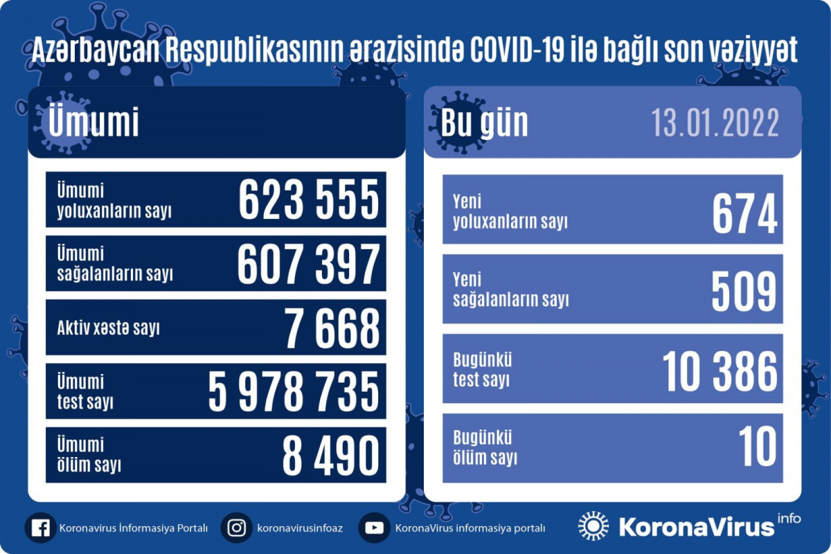 Azərbaycan Respublikasında koronavirus (COVID-19) infeksiyasına 674 yeni yoluxma faktı qeydə alınıb, 509 nəfər müalicə olunaraq sağalıb.