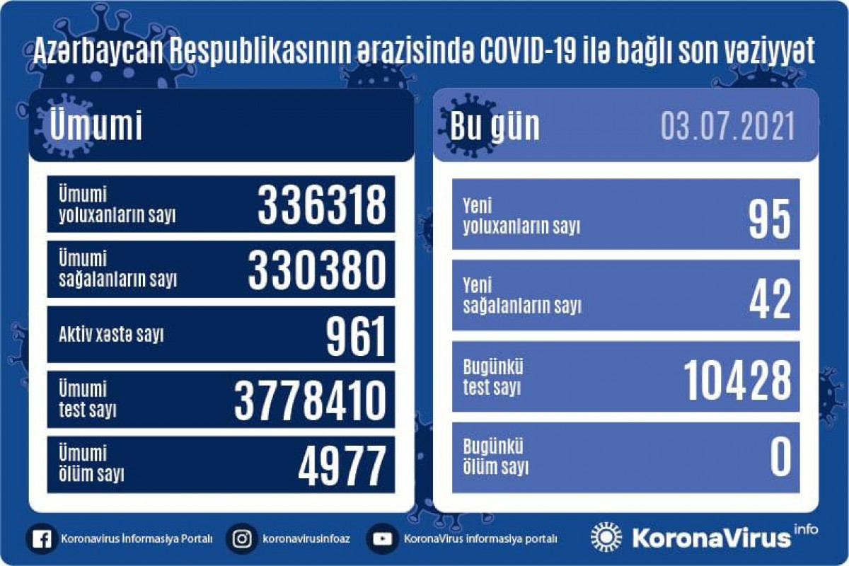 Azərbaycan Respublikasında koronavirus (COVID-19) infeksiyasına 95 yeni yoluxma faktı qeydə alınıb, 42 nəfər müalicə olunaraq sağalıb.