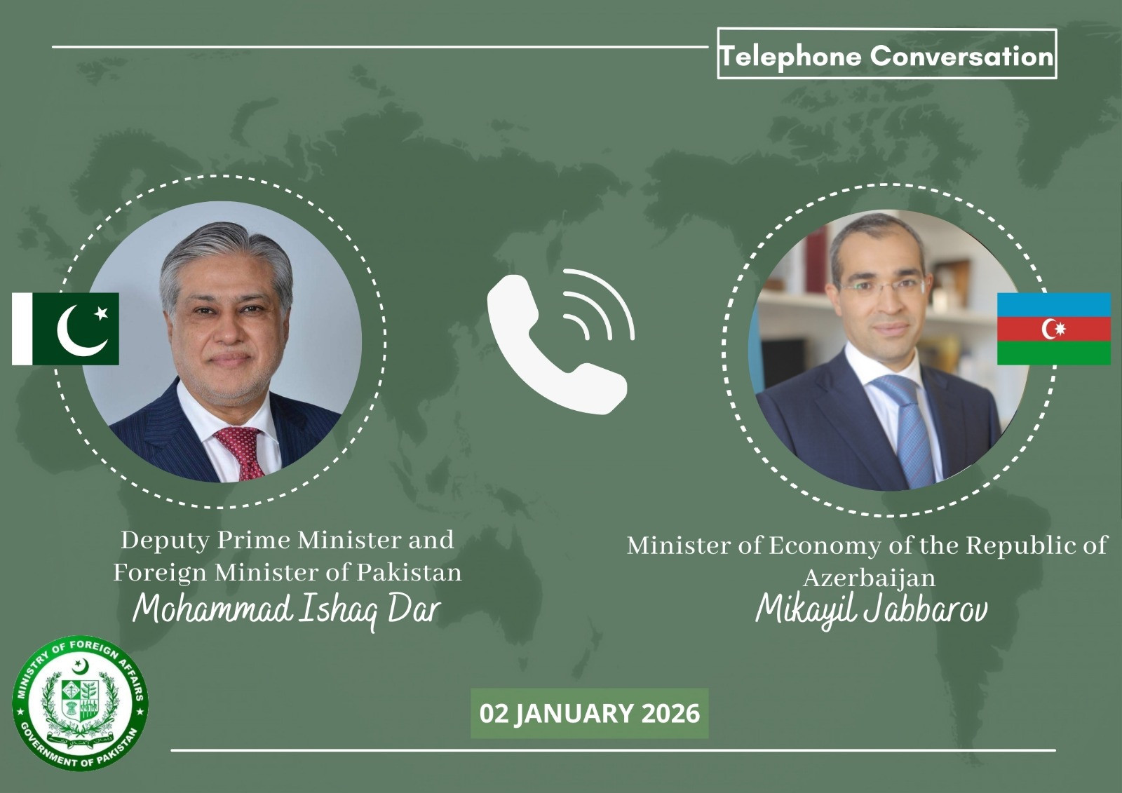 Azərbaycanın iqtisadiyyat naziri Mikayıl Cabbarov və Pakistanın xarici işlər naziri İshaq Dar arasında telefon danışığı olub.