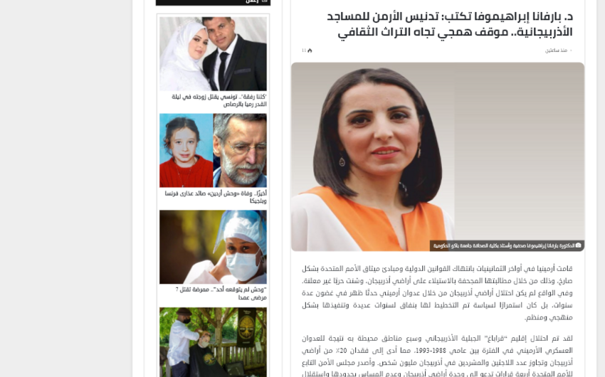 Jurnalist Pərvanə İbrahimovanın Misirin nüfuzlu “Nilenews” və Əlcəzairin “Əl Hərir” portallarında “Ermənilər tərəfindən Azərbaycan məscidlərinin murdarlanması mədəni irsə barbar münasibətdir” sərlövhəli geniş məqaləsi dərc olunub.