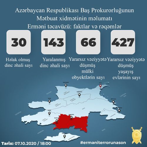Qurumun Mətbuat xidmətindən verilən məlumata görə, Ermənistan silahlı qüvvələrinin hücumları nəticəsində 30 mülki şəxsi qətlə yetirilib, 143 nəfəri isə yaralanıb.