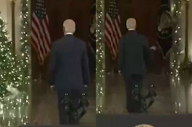 Görüntülərdə Co Bayden Milad nitqini bitirdikdən sonra geriyə dönür və addımlamağa başlayır. Sonra anidən heç kimin olmadığı yerə - boşluğa əli ilə işarət edərək salam verir.