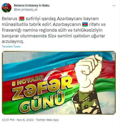 Belarusun Azərbaycandakı səfirliyi Zəfər Günü münasibətilə paylaşım edib.
