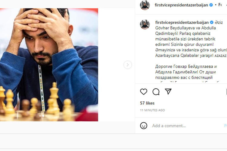 Birinci vitse-prezident Mehriban Əliyeva 20 yaşa qədər şahmatçılar arasında dünya çempionu olan Gövhər Beydullayeva və Abdulla Qədimbəylini təbrik edib.