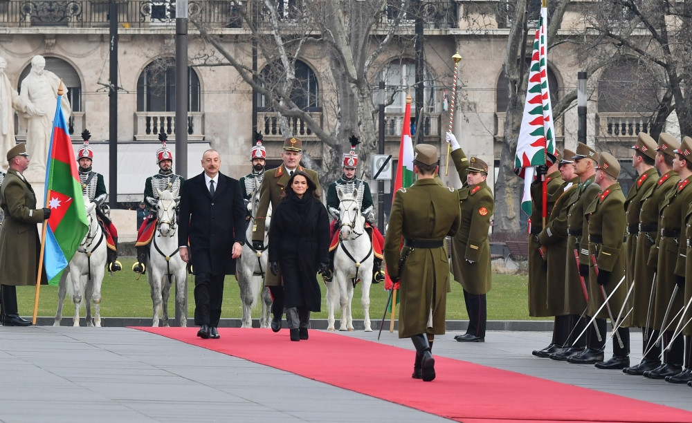 Azərbaycanın və Macarıstanın Dövlət bayraqlarının dalğalandığı meydanda Prezident İlham Əliyevin şərəfinə fəxri qarovul dəstəsi düzülüb.