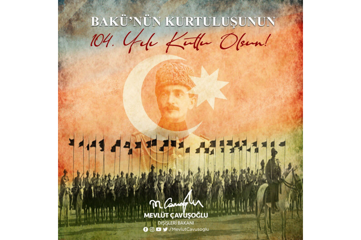 Türkiyə xarici işlər naziri Mövlud Çavuşoğlu Bakının işğaldan azad olunmasının 104-cü ildönümü ilə bağlı "Twitter"də paylaşım edib.