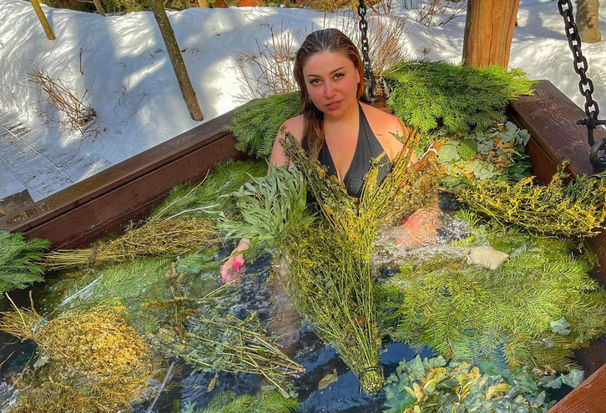 Damla qarlı havada odunla qızdırılan vannaya girib, maraqlı terapiya qəbul edib.
