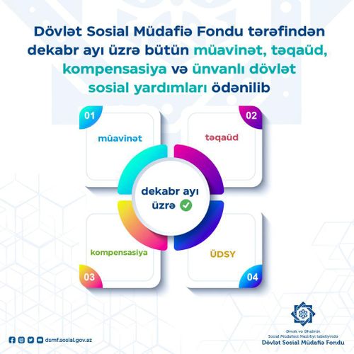 Əmək və Əhalinin Sosial Müdafiəsi Nazirliyinin tabeliyindəki Dövlət Sosial Müdafiə Fondu tərəfindən dekabr ayı üzrə bütün müavinət, təqaüd, kompensasiya və ünvanlı dövlət sosial yardımları ödənilib.
