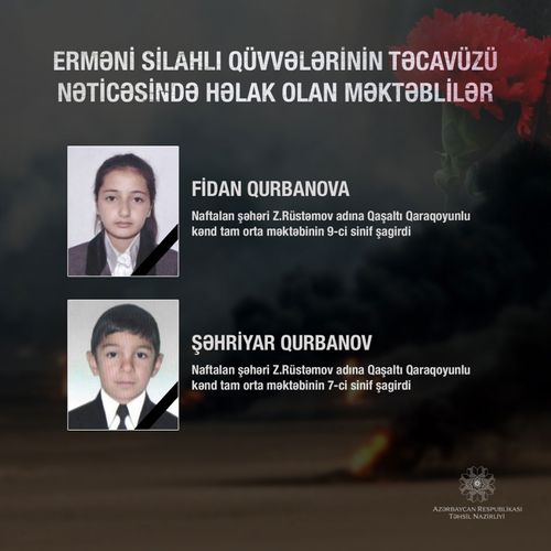 Sentyabrın 27-dən Ermənistan silahlı qüvvələrinin yaşayış məntəqələrimizi atəşə tutması nəticəsində Naftalan şəhərində bütöv bir ailə həlak olub. Təəssüflə qeyd edirik ki, bu təcavüz nəticəsində həlak olanlardan ikisi məktəblidir. 2007-ci il təvəllüdlü Şəhriyar Qurbanov və onun əmisi qızı, 2006-cı il təvəllüdlü Fidan Qurbanova Z.Rüstəmov adına Qaşaltı Qaraqoyunlu kənd tam orta məktəbinin şagirdləridir.