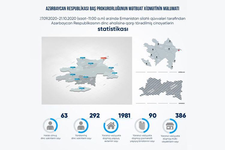 Baş Prokurorluğun mətbuat xidmətindən verilən məlumata görə, sentyabrın 27-dən hazırkı vaxtadək ermənilərin yaşayış məntəqələrini atəşə tutması nəticəsində 63 mülki şəxs həlak olub, 292 nəfər yaralanıb.