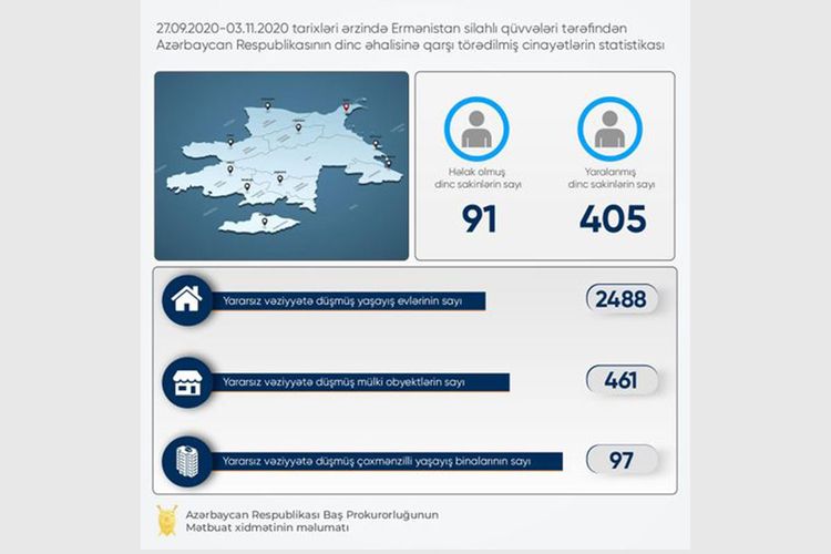 Baş Prokurorluğun mətbuat xidmətindən verilən məlumata görə, sentyabrın 27-dən hazırkı vaxtadək Ermənistan ordusunun yaşayış məntəqələrini atəşə tutması nəticəsində 91 mülki şəxs həlak olub, 405 nəfər yaralanıb.