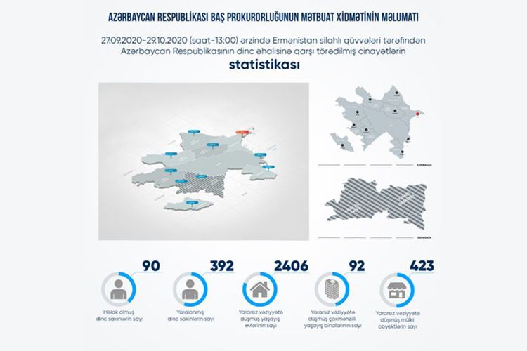 Baş Prokurorluğun mətbuat xidmətindən verilən məlumata görə, sentyabrın 27-dən hazırkı vaxtadək Ermənistan ordusunun yaşayış məntəqələrini atəşə tutması nəticəsində 90 mülki şəxs həlak olub, 392 nəfər yaralanıb.