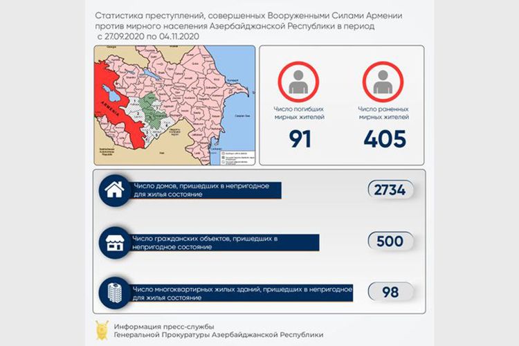 Baş Prokurorluğun mətbuat xidmətindən verilən məlumata görə, sentyabrın 27-dən hazırkı vaxtadək Ermənistan ordusunun yaşayış məntəqələrini atəşə tutması nəticəsində 91 mülki şəxs həlak olub, 405 nəfər yaralanıb.