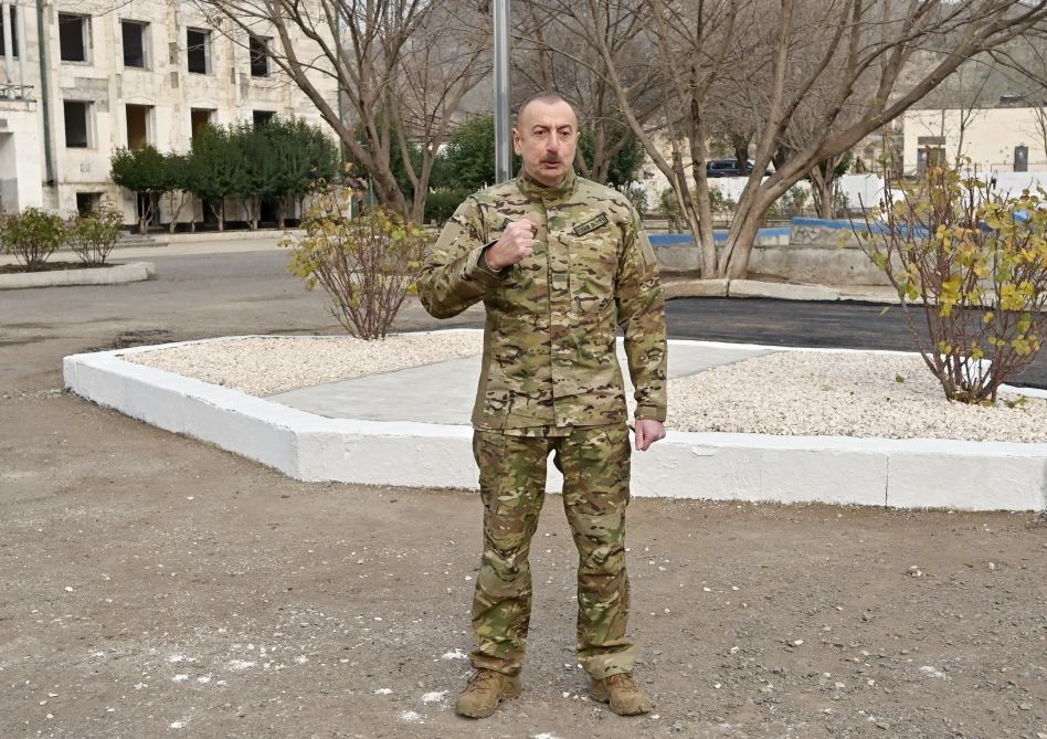 "Bu gün vaxtilə işğal edilmiş torpaqlarda Azərbaycan Bayrağı dalğalanır. Bu gün Ali Baş Komandan kimi, mən azad edilmiş bu torpaqlarda əsgərlərlə görüşürəm. Artıq bu bölgənin, Qarabağ bölgəsinin bərpası ilə bağlı konkret addımlar atılır, ilkin kontraktlar imzalanmışdır. Mənfur düşmən hər şeyi dağıdıb. Yol boyunca Cəbrayıl rayonundan, azad edilmiş torpaqlardan başlayaraq, bax, Qubadlıya qədər hər tərəf dağıdılıb. Bir dənə də salamat bina yoxdur. Təkcə Qubadlıda bir neçə bina qalıb ki, burada hərbçilər və onların ailə üzvləri yaşayıblar. Bütün binalar, bütün evlər, tarixi abidələrimiz, məscidlərimiz, qəbirlərimiz mənfur düşmən tərəfindən dağıdılıb. Bu cinayətlərin hamısı sənədləşdirilir.