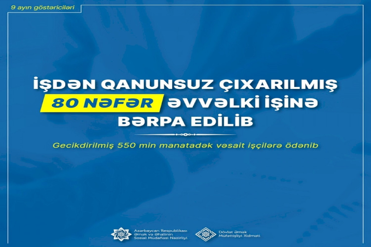 Əmək və Əhalinin Sosial Müdafiəsi Nazirliyi yanında Dövlət Əmək Müfəttişliyi Xidməti 2022-ci ilin 9 ayı ərzində vətəndaş müraciətlərinin araşdırılması zamanı 80 işçinin əmək müqavilələrinə qanunvericiliyin tələbləri pozulmaqla xitam verildiyini müəyyən edib.