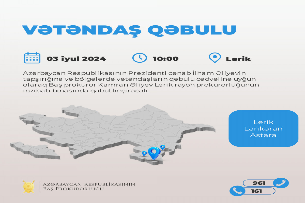 Azərbaycan Respublikasının Prezidenti İlham Əliyevin tapşırığına və bölgələrdə vətəndaşların qəbulu cədvəlinə uyğun olaraq Baş prokuror Kamran Əliyev cari il iyulun 3-də, saat 10:00-da Lerik rayon prokurorluğunun inzibati binasında Lerik, Lənkəran və Astara rayon sakinlərinin qəbulunu keçirəcək.