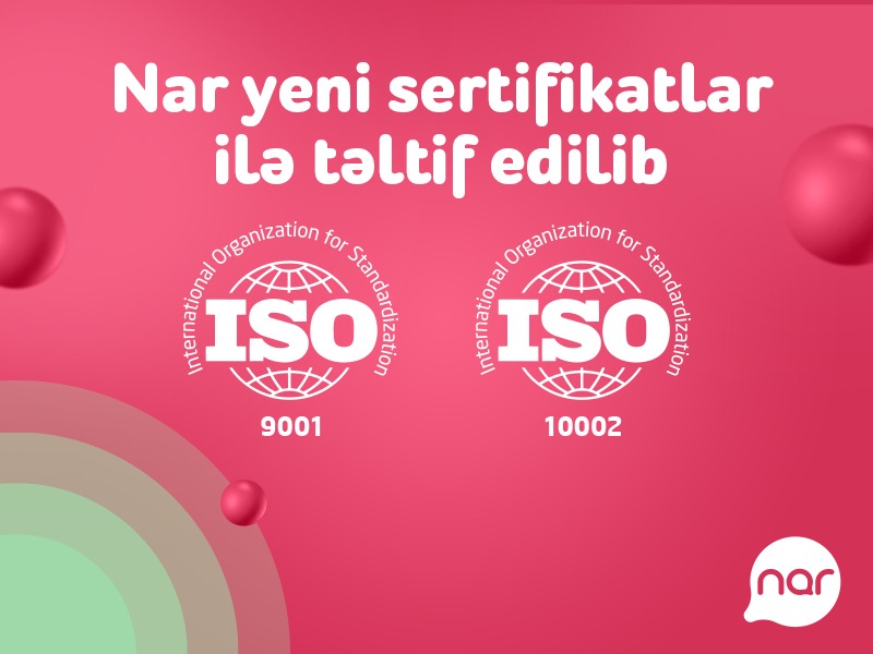 "Nar" müştəriyönümlülük strategiyasının beynəlxalq səviyyədə tanınması ilə daha bir uğura imza atdı.Mobil operator ISO 9001:2015 Keyfiyyətin İdarə olunması və ISO 10002:2018 Müştəri Məmnuniyyətinin İdarə olunmasıüzrə beynəlxalq sertifikatlara layiq görülüb. Qiymətləndirilmə aparıcı beynəlxalq yoxlama və sertifikatlaşdırma şirkəti olan “Bureau Veritas Group” tərəfindən aparılıb. “Nar” müştərilərinə etibarlı şəkildə yüksək keyfiyyətli xidmətlər təqdim etmək öhdəliyini davamlı şəkildə nümayiş etdirərək Beynəlxalq Standartlaşdırma Təşkilatının meyarlarına cavab verib.