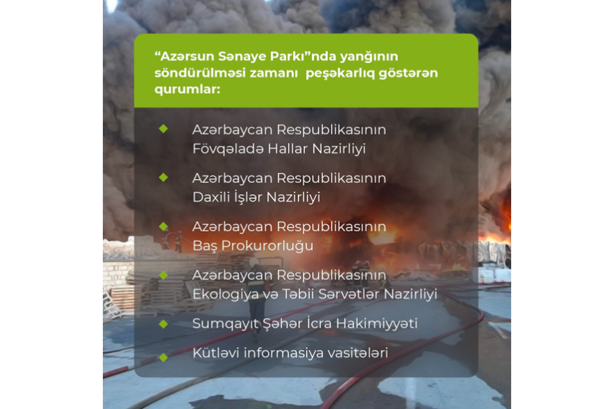 “Sumqayıt şəhərinin Hacı Zeynalabdin qəsəbəsində yerləşən “Azərsun Sənaye Parkı”nın ərazisində baş vermiş yanğının söndürülməsi və nəticələrinin aradan qaldırılmasında iştirak etmiş dövlət qurumları əməkdaşlarının peşəkarlığı ilə fəxr edir və onlara dərin minnətdarlığımı bildirirəm”.