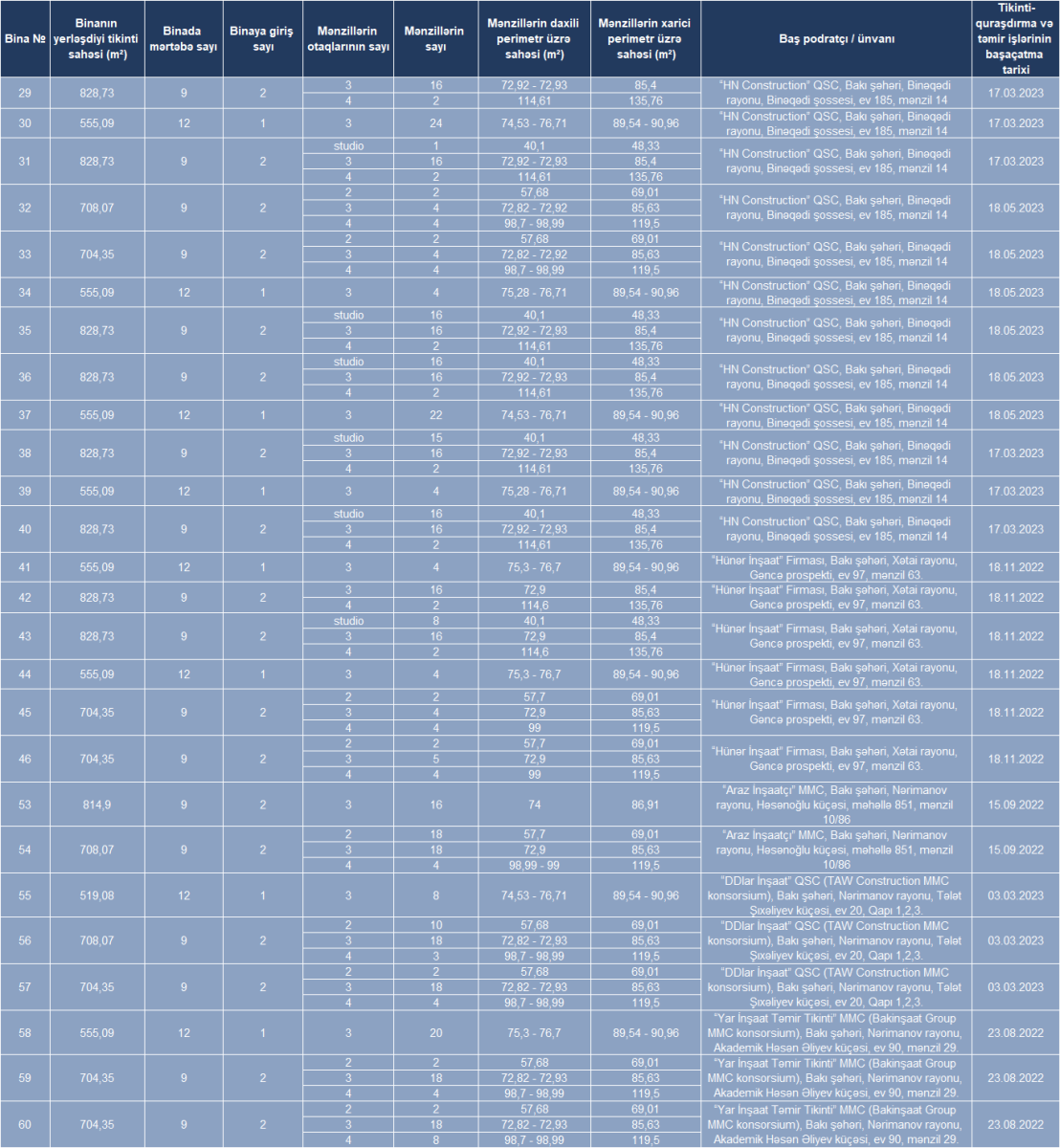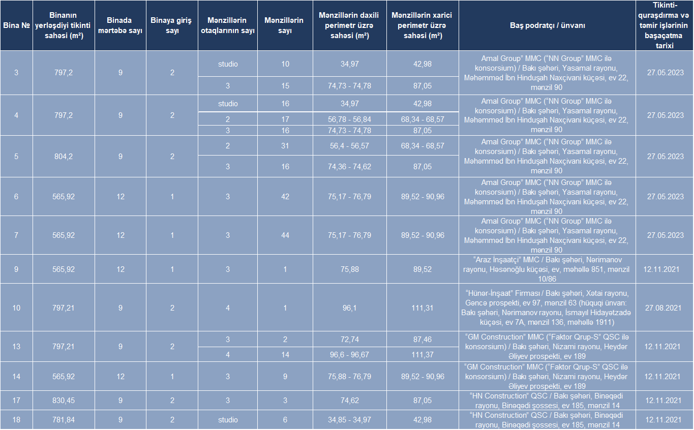Satışa Yasamal Yaşayış Kompleksinin ikinci mərhələsi üzrə 436, Hövsan Yaşayış Kompleksinin ikinci mərhələsi üzrə 510, Gəncə Yaşayış Kompleksi üzrə 243 olmaqla, ümumilikdə 1189 mənzil çıxarılır. Bütün mənzillər tam təmirli, mətbəx mebeli, kombi isitmə sistemi (kombi cihazı daxil olmaqla), su, qaz və elektrik sayğacları ilə təmin edilmiş vəziyyətdə təklif olunur.