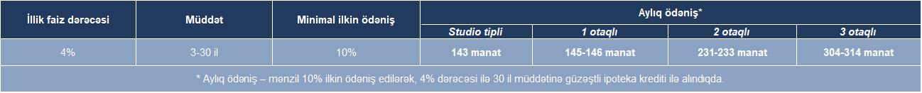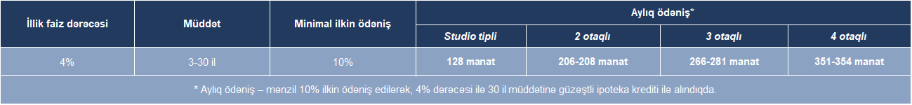 DİQQƏT! Mənzilə güzəştli ipoteka krediti vasitəsilə sahib olmaq istəyən vətəndaş minimal ilkin ödənişdən artıq ödənilən məbləğə görə, mənzilin satış qiymətini tam həcmdə öz vəsaiti hesabına birdəfəlik ödəyən vətəndaş isə bütün məbləğə əlavə 10% endirim əldə edəcək.