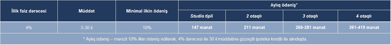 Bu elan çərçivəsində mənzillərin satışı həm ipoteka kreditindən istifadə etməklə, həm də öz vəsaiti hesabına ödəniş üsulu ilə nəzərdə tutulmuşdur.