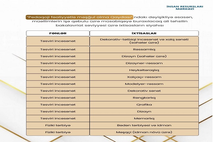 Nəzərinizə çatdırırıq ki, hər il müsabiqəyə buraxılacaq ixtisasların siyahısı “Pedaqoji fəaliyyətlə məşğul olma Qaydası”nın əlavəsində qeyd edilən ixtisaslara müvafiq olaraq müəyyənləşdirilir.