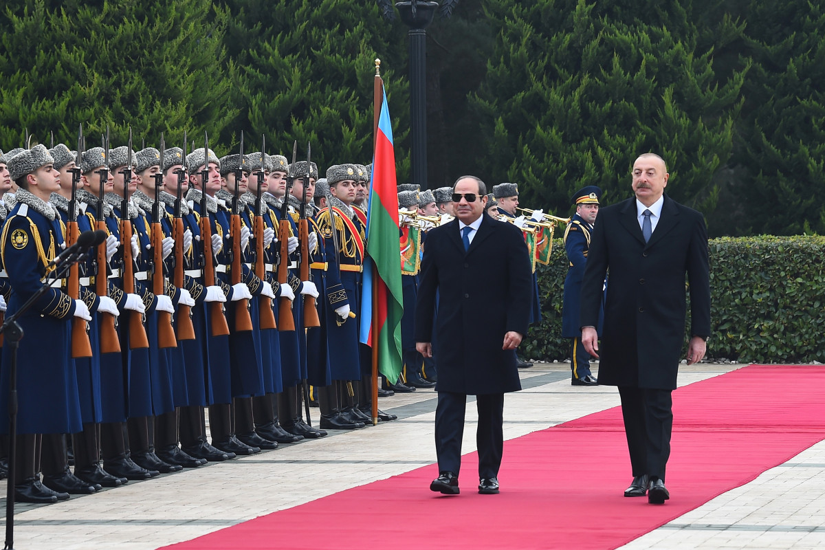 Hər iki ölkənin Dövlət bayraqlarının dalğalandığı meydanda Misir Prezidentinin şərəfinə fəxri qarovul dəstəsi düzülüb.