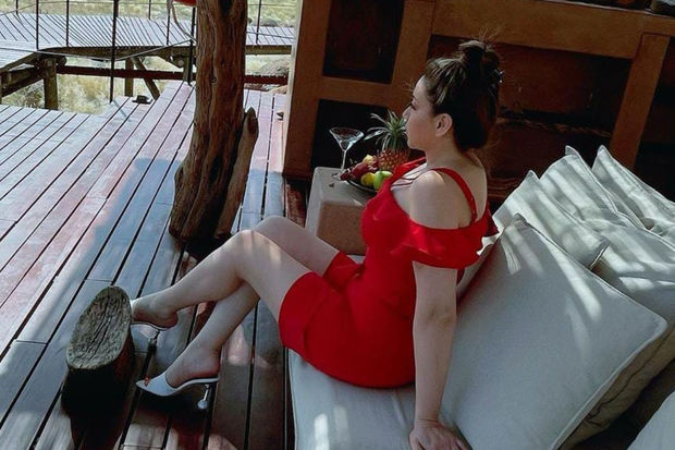 Müğənni qısa qırmızı şortik tulumu ilə poza verib.